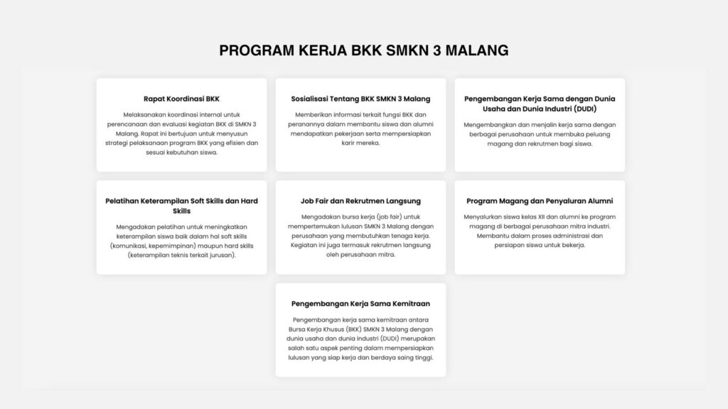 BKK SMKN 3 Malang menyusun beberapa program kerja utama yang berfokus pada pelayanan karier dan pengembangan jaringan industri.